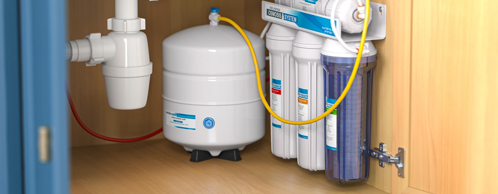 A reverse osmosis system uses high water pressure to push water through a semipermeable membrane that filters some chemicals, minerals, and bacteria. This system generally is installed in the kitchen, where you need pristine water for consumption and cooking.